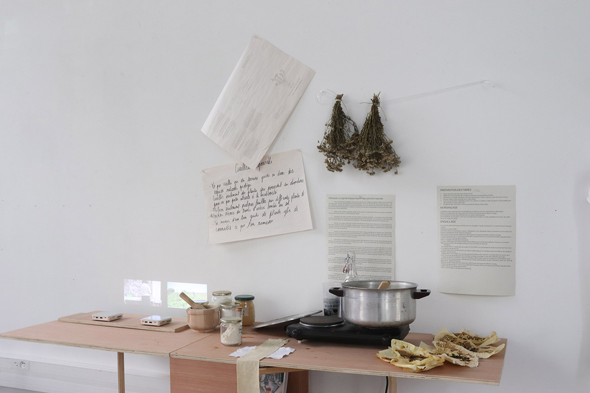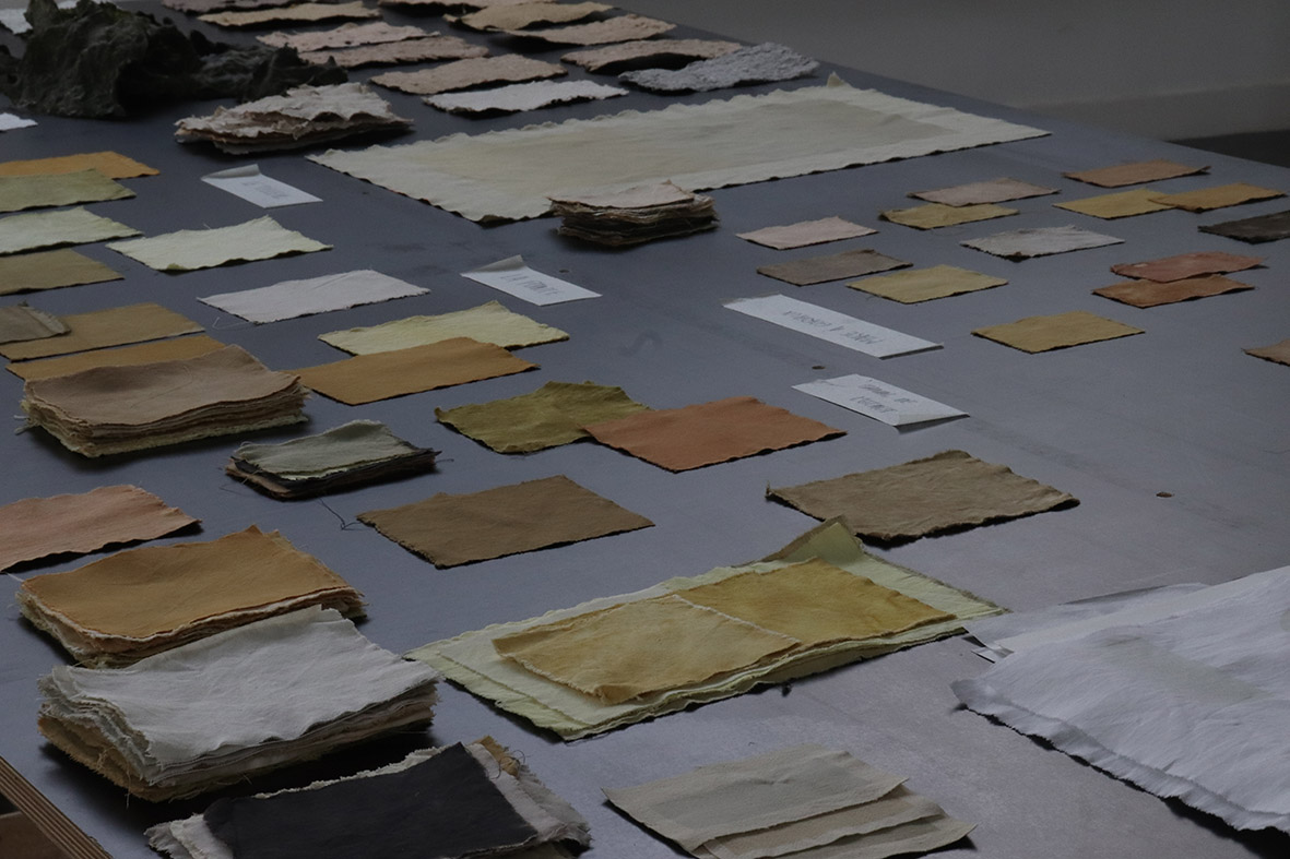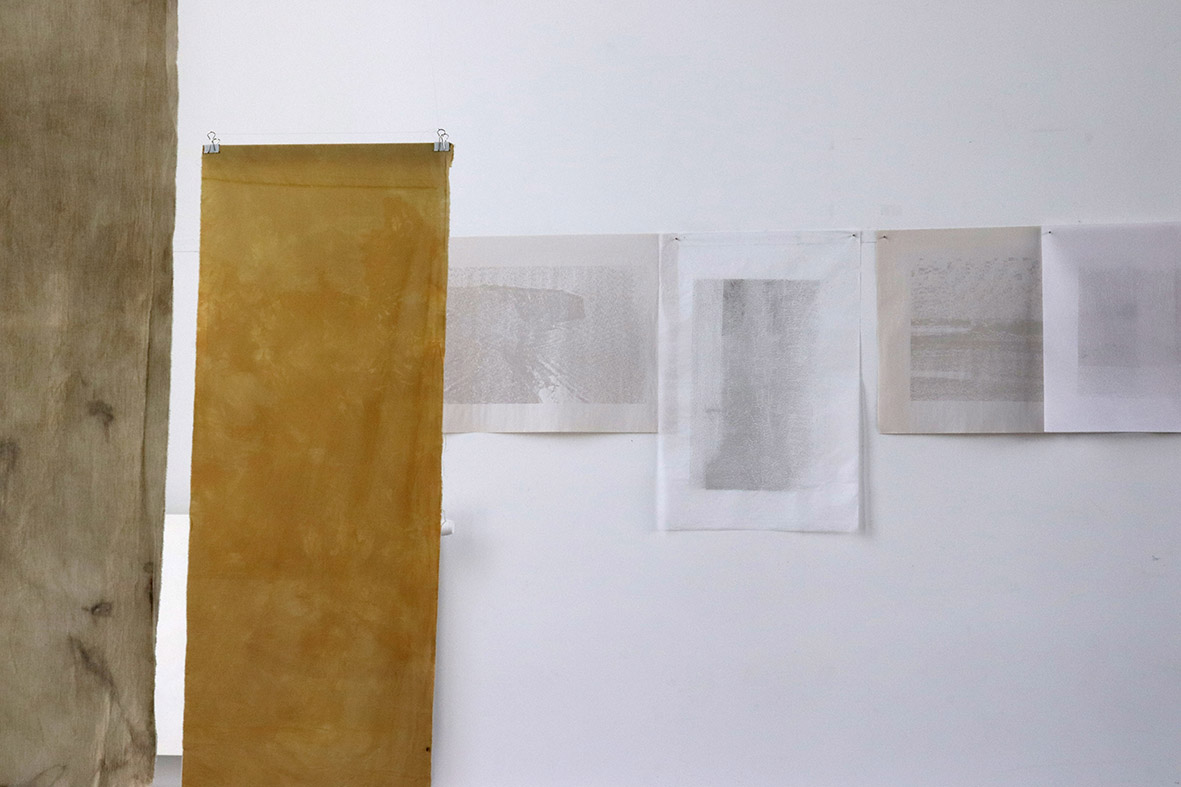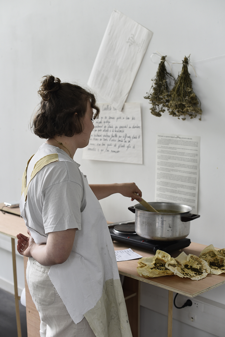 Les paysages auxquels je suis attachée sont amenés à disparaître, j’expérimente donc de nouvelles façons de créer et de fabriquer pour les faire exister autrement. La teinture végétale et tout ce qui en découle constituent la base de mon processus créatif. En extrayant l’essence du paysage à travers la couleur, j’essaie de mettre en relation la fragilité des paysages qui m’entourent avec celle des supports que je crée. Les morceaux de tissus, les papiers et les pigments sont des traces, des empreintes, des souvenirs de ces balades.