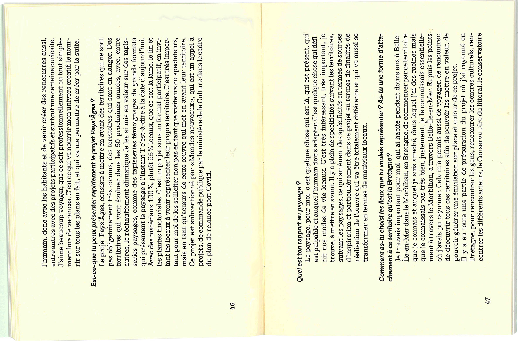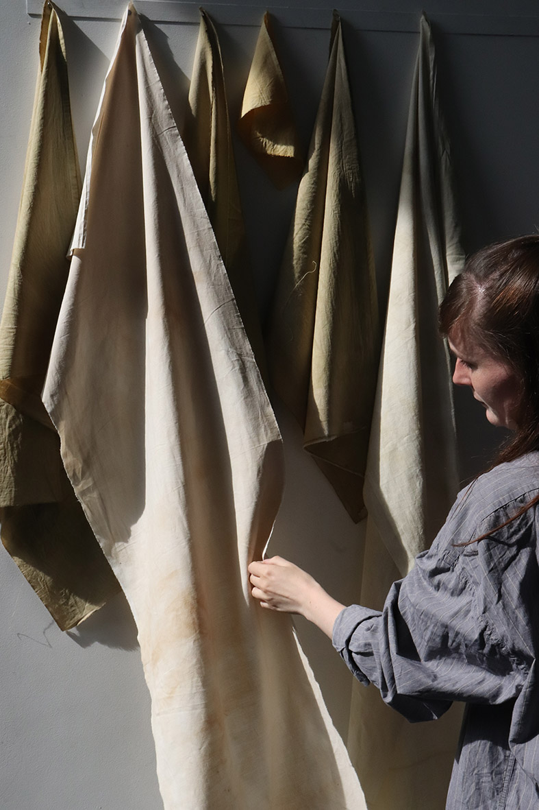 The landscapes I like are going to disappear, so I'm experimenting with new ways of creating and making things to make them exist in a different way. Natural dyeing and all that flows from it form the basis of my creative process. By extracting the essence of the landscape through colour, I try to relate the fragility of the landscapes that surround me to the fragility of the materials I create. The pieces of fabric, paper and pigments are traces, imprints and memories of these walks.