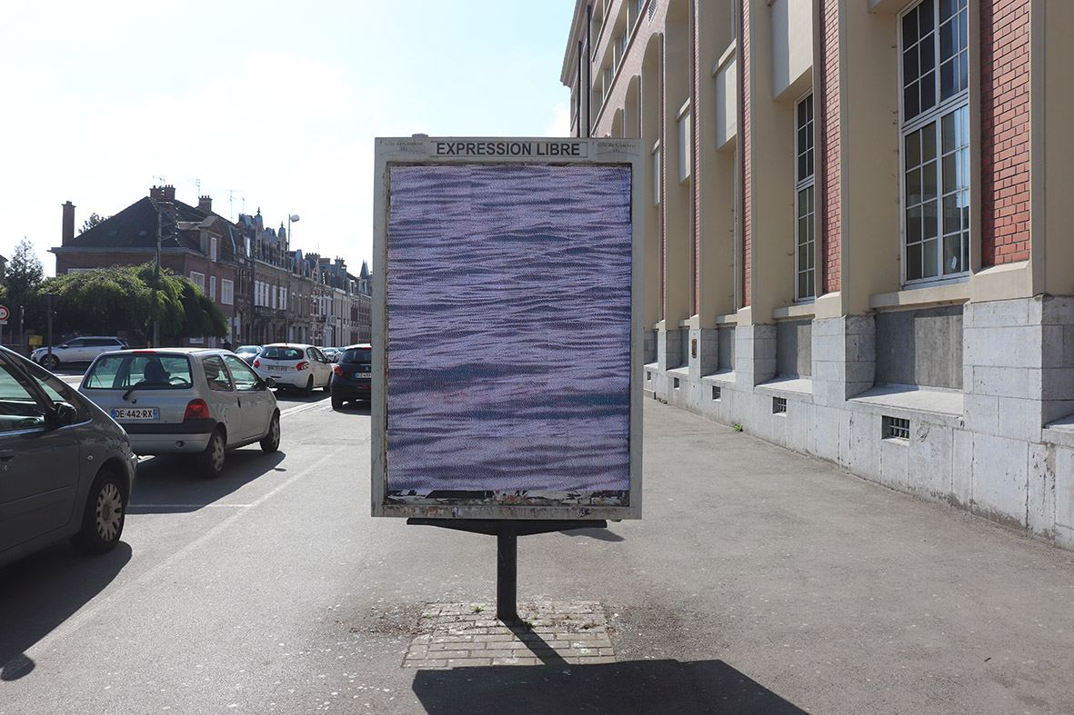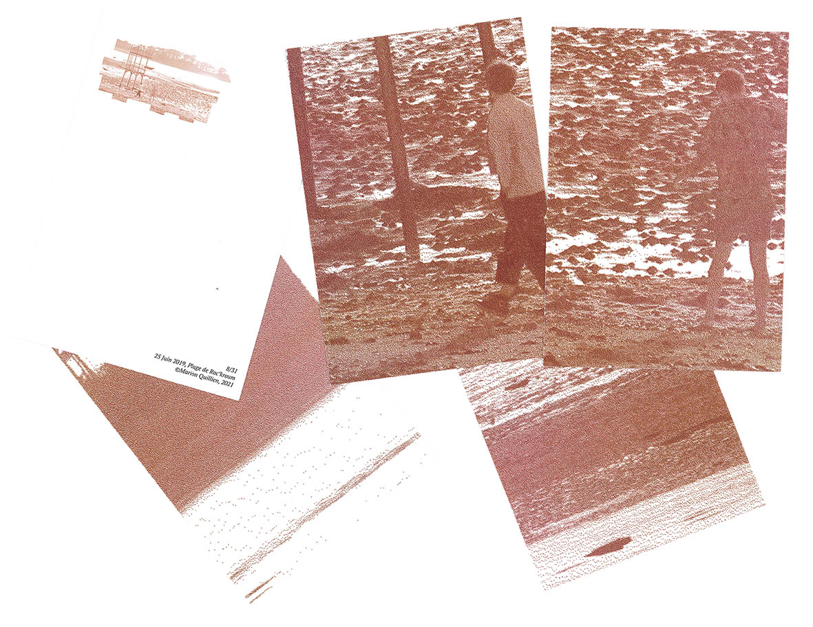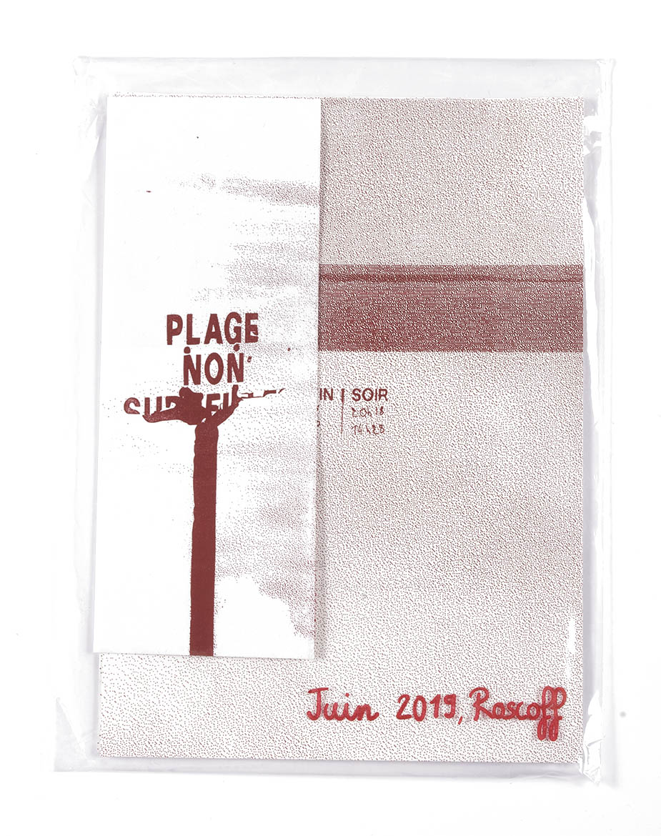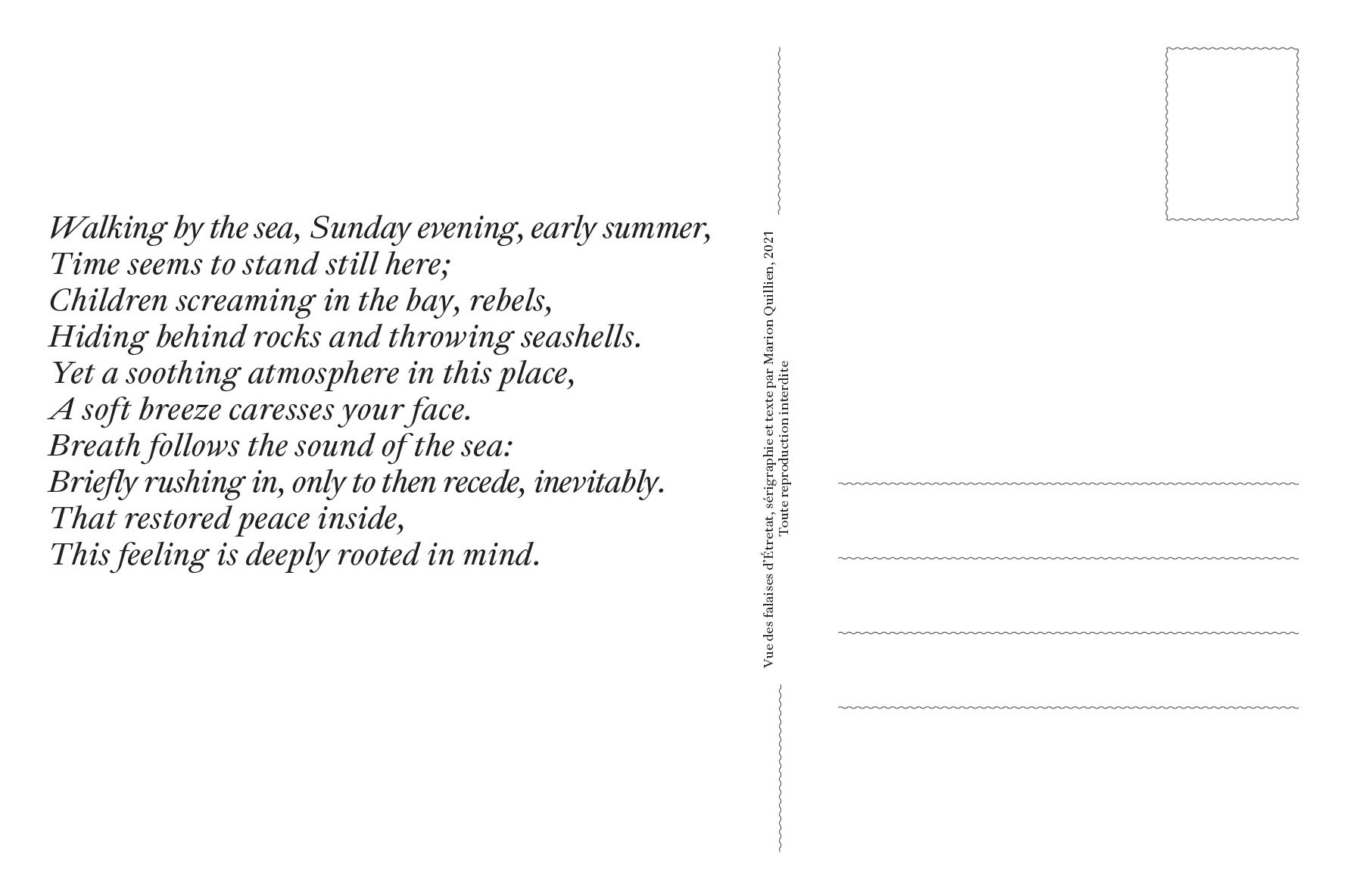 Affiche et cartes postales d’une même photo sérigraphiée qui illustrent un poème qui narre une expérience de la mer, un peu comme un récit de vacances. Le poème est décliné sur deux supports différents, chacun ayant une visée différente.