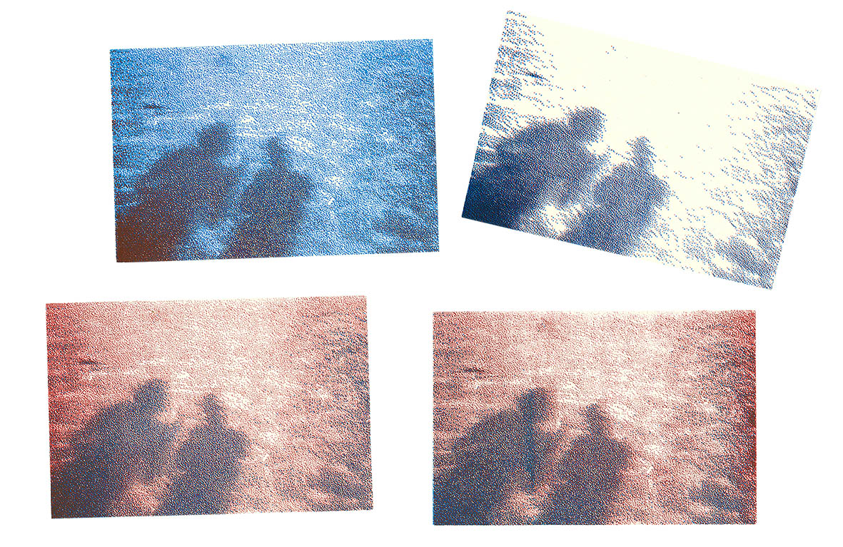 Poster and postcards of the same screen-printed photo illustrating a poem that narrates an experience of the sea, a bit like a holiday story. The poem is presented on two different media, each with a different purpose.